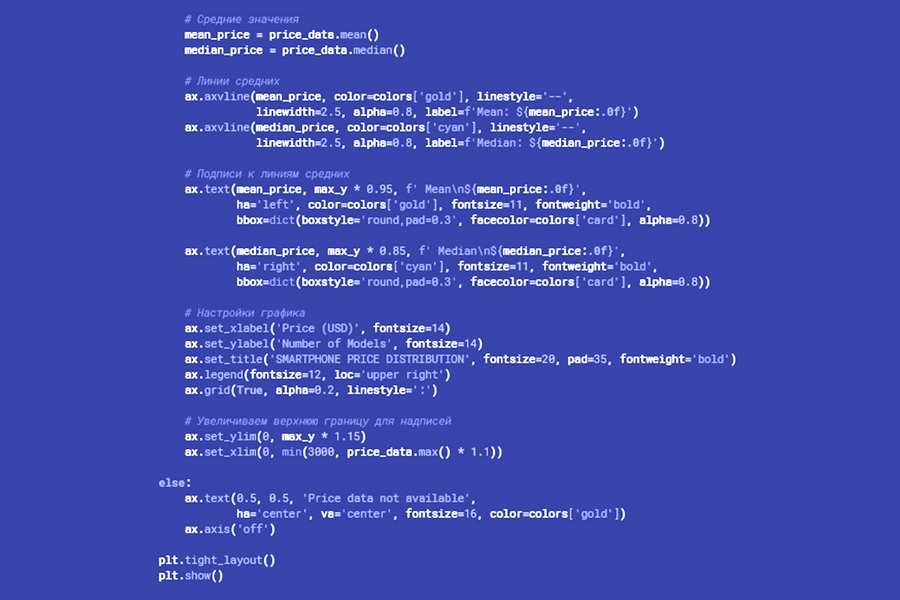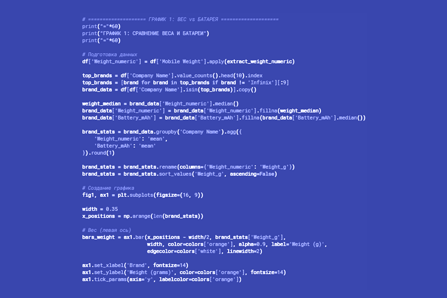 Работа начата с импорта необходимых библиотек: pandas для работы с данными, matplotlib для визуализации и numpy для математических операций. Потом был загружен CSV-файл с данными о смартфонах и сразу пришлось столкнуться с первой проблемой — данные о весе устройств были в разных форматах.