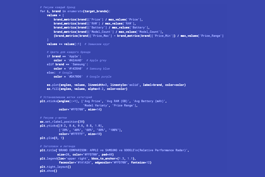 Самой сложной задачей была подготовка данных для радарной диаграммы. Нужно было нормализовать значения разных параметров (вес, цена, ОЗУ, батарея) к единой шкале от 0 до 1. Для веса и цены использована обратная нормализация — ведь меньше вес и ниже цена обычно лучше. Это потребовало дополнительной математической обработки.