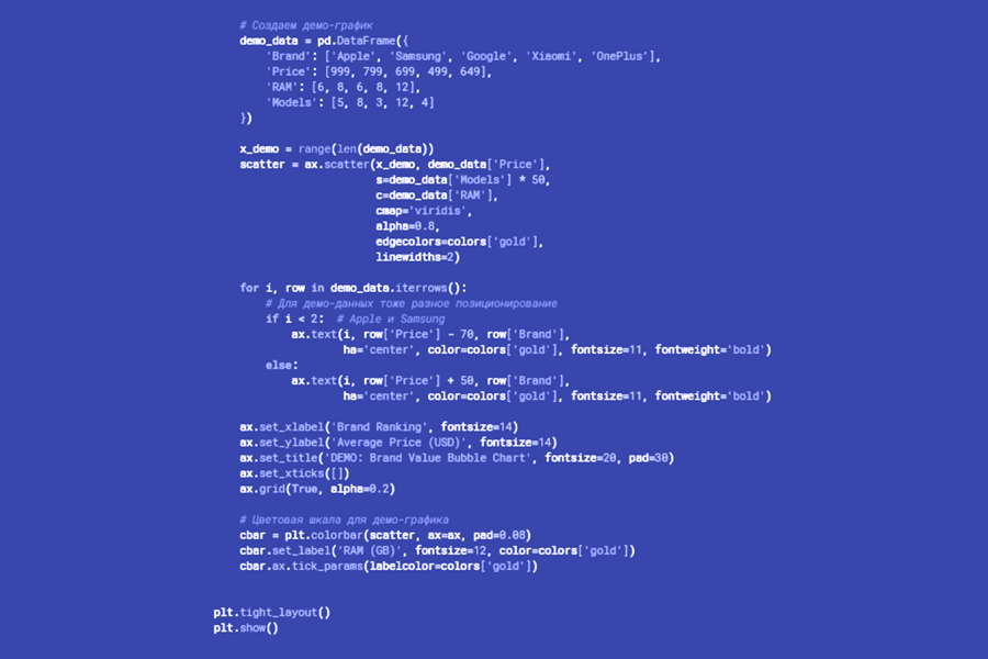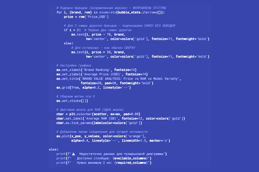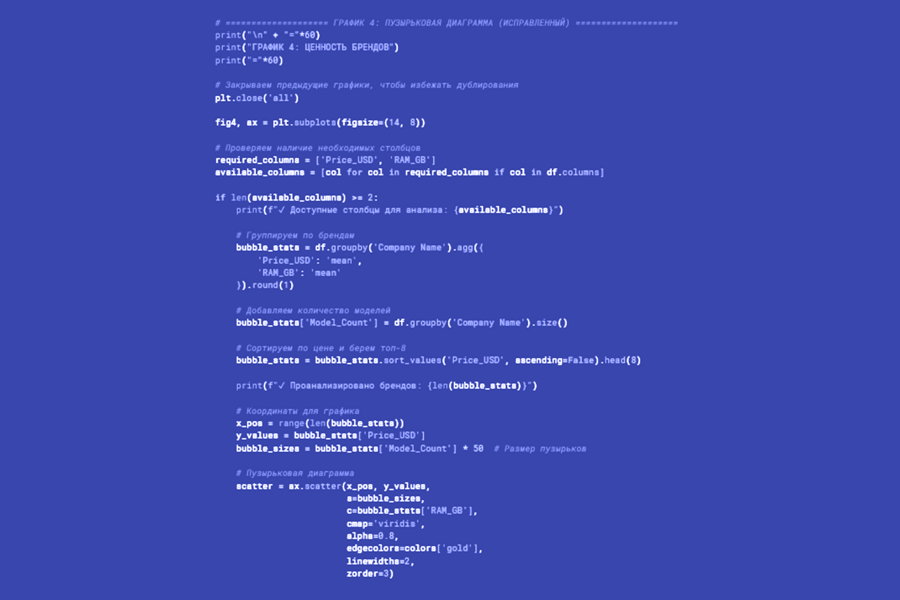 Для пузырьковую диаграммы использовался метод pivot_table, чтобы создать матрицу зависимости между брендами, ценами и техническими характеристиками. Была проблема — некоторые бренды имели слишком мало моделей, что искажало статистику. Это было решено фильтрацией, так остались бренды с минимум 5 моделями в данных.