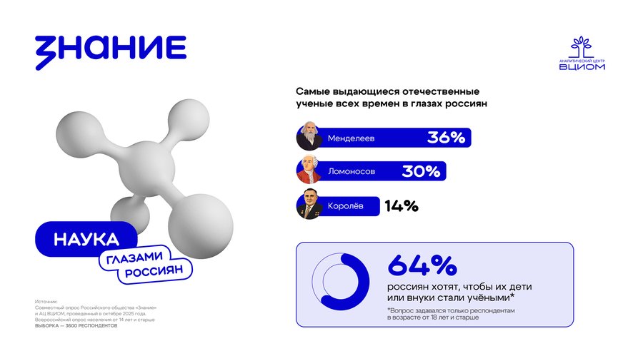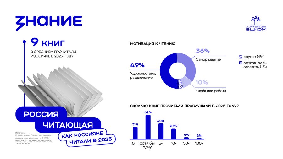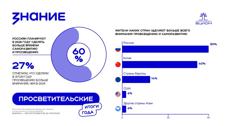 Проект визуализирует некоторые исследования, проведенные в 2025 году Российским обществом Знание (самостоятельно или совместно с Аналитическим центром ВЦИОМ). Инфографика раскрывает портрет современной аудитории и ее интересы.
