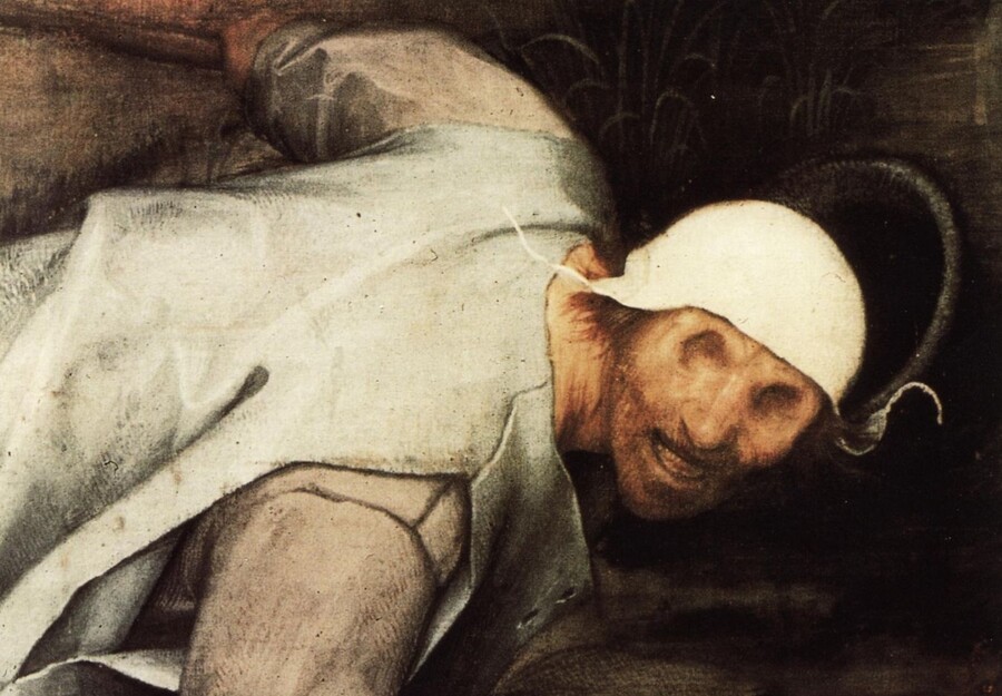 На картине Питера Брейгеля «Притча о слепых» автор выстраивает сложную философскую притчу, где телесная аномалия становится зримым воплощением духовной слепоты, фатальной ошибки коллективного движения «вслепую». При этом Брейгель с натурализмом передает физиологию незрячих — закатившиеся глазницы, неуверенные позы, цепкие руки. Нельзя не отметить хореографию их падения: каждый следующий слепец, цепляясь за предыдущего, повторяет его роковую ошибку, показывая визуальную формулу человеческой глупости и следования ложным ориентирам. В этом произведении телесная аномалия осмысливается как художественный инструмент для размышлений о природе заблуждения, социального подражания.