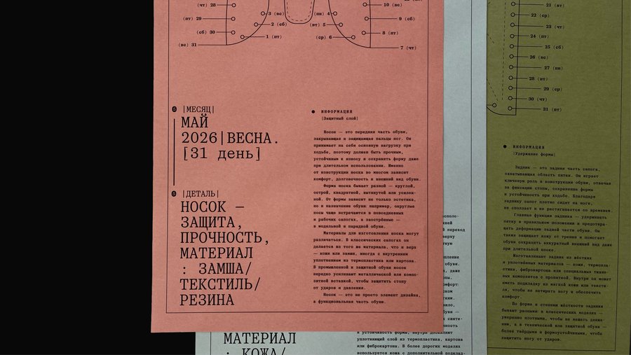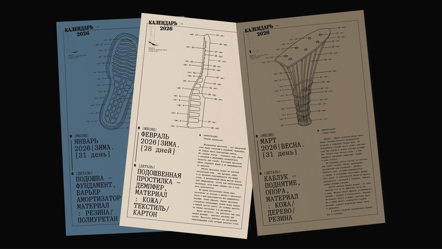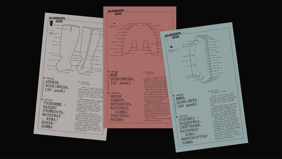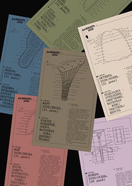 Календарный год как создание пары классических сапог, где каждый месяц посвящён одной детали, из которой состоит обувь. Страницы календаря построены по принципу технических инструкций сапожников, раскрывая тонкости изготовления сапога. К концу года человек узнает о всех важных элементах и сможет прочувствовать кропотливость процесса создания пары обуви.