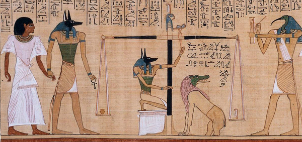 Фрагмент папируса Ани (ок. 1250 год до н. э.) с изображением суда Осириса. На весах лежат сердце и перо Маат.