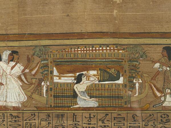 Этот изящный фрагмент погребального папируса украшен виньетками из главы 89 «Книги мёртвых». На нём изображена птица Ба в полёте, парящая над мумией, лежащей на ложе для бальзамирования.