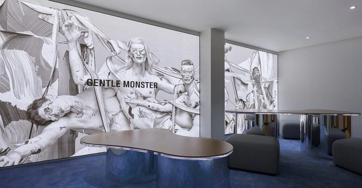 Флагманский магазин Gentle Monster превращен в театрализованное пространство. Движущиеся конструкции, световые тоннели и лабиринтная планировка создают атмосферу музея современного искусства.