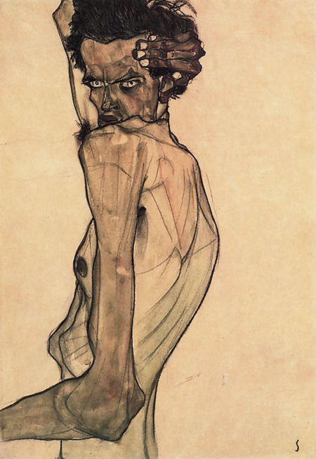Очередное болезненное изображение себя Шиле предлагает зрителю на следующем автопортрете. Обнаженный, худощавый мужчина, в геометричной, угловатой позе смотрит до безумного внимательным взглядом.