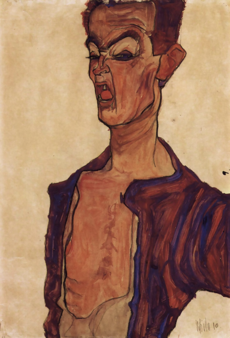 За свою карьеру Эгон Шиле написал более сотни автопортретов. Он изучал себя и природу человека изображая свое тело в различных позах, с разными выражениями лица и жестами, специально стараясь передать максимальную точность эмоции: боли, отчаяния, безразличия, страха, интереса. Художник намеренно искажал свое тело, изувечивал и «ломал» его, словно стараясь рассмотреть со всех возможных сторон, показать уязвимость и вырывающиеся наружу эмоции.