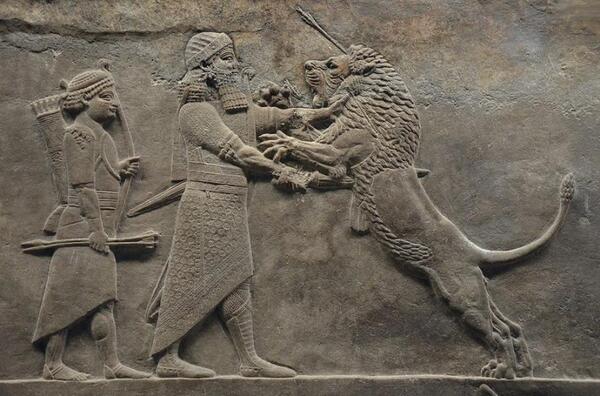 Нередки случаи, когда образ льва служил для восхваления силы людей. Яркий пример — ассирийские рельефы дворца. Посылом искусства воинственной Ассирии часто становилась идея восхваления царя с целью устрашения его противников и сохранения авторитета, и для этого удачно подходила сцена охоты на свирепое и большое животное. Вряд ли кто-то не согласится, что победивший льва человек — силен, бескомпромиссен и тверд. Следовательно, не каждый мог рискнуть посягнуть на величие правителя, кто оказался сильнее «царя зверей». Похожий смысл можно заметить и в греческой культуре в мифе про Геракла и немейского льва: герой побеждает кровожадное существо, тем самым утверждая свое исключительное могущество. Важно обратить внимание и на изображение людей: в обоих скульптурах они показаны нарочито больше животных, что также утверждает конкретно их неоспоримую силу и власть.