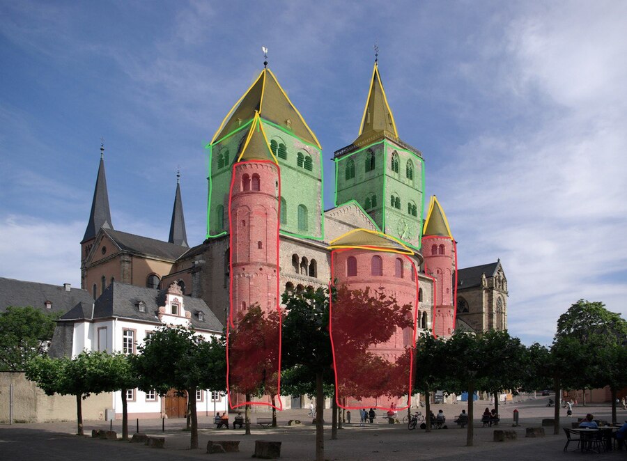 Немецкая готическая архитектура оперирует крупными, цельными геометрическими фигурами — цилиндрами, параллелепипедами, конусами. Например, Трирский собор сильно напоминает романские памятники за счёт массивных объёмов, из которых он сложен. Однако благодаря стрельчатым аркам и бифориям в нём проявляется готическая изящность.