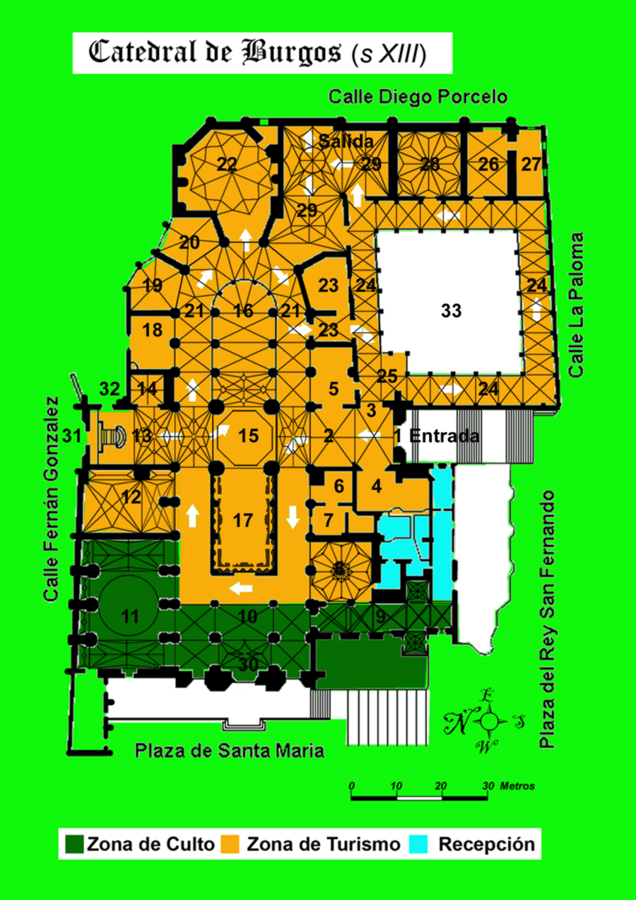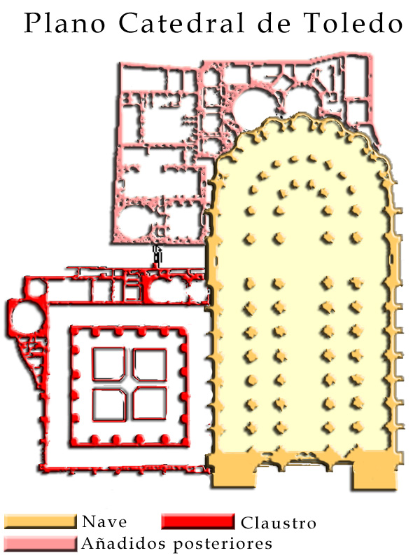 Ярко выраженной особенностью испанских соборов является свободный, нерегулярный план. Практически в каждом из них можно заметить отсутствие строгой симметрии: основное здание обрастает разнообразными пристройками, расположенными на разных уровнях. Отсутствие чёткого плана создаёт ощущение скорее городской площади в Северной Африке, нежели традиционного готического собора (как, например, в Германии). Основной объём «обрастает» всевозможными террасами и двориками. Так собор формами своего плана более плавно и органично взаимодействует с окружающим городским пространством.
