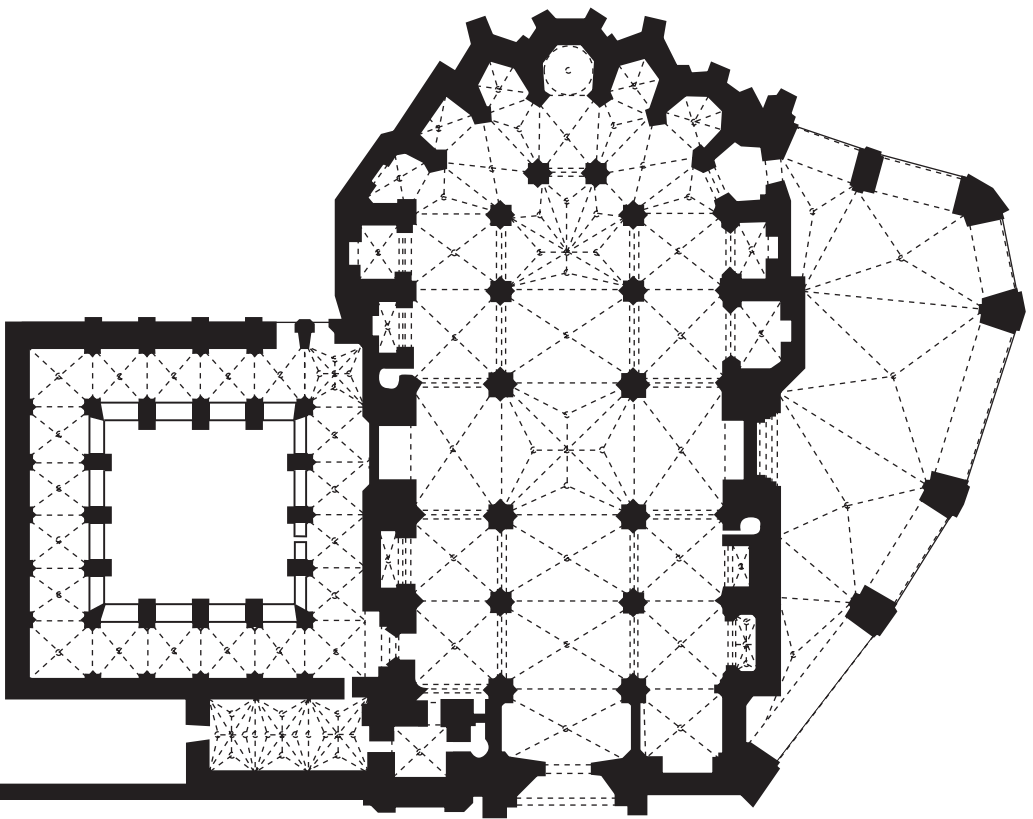 Интересно также отметить обилие тонких линий в декоративном оформлении. Традиционные формы пилястр, пучков колонн и пинаклей здесь максимально утончаются, превращаясь в острые «стрелки», стремящиеся ввысь. Создается впечатление, что собор словно сложен из острых пиков.
