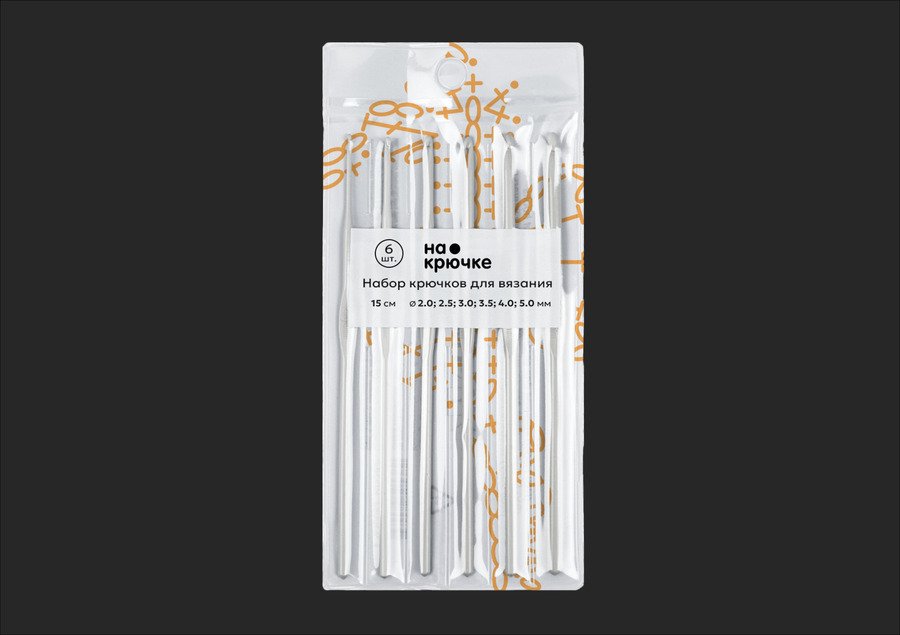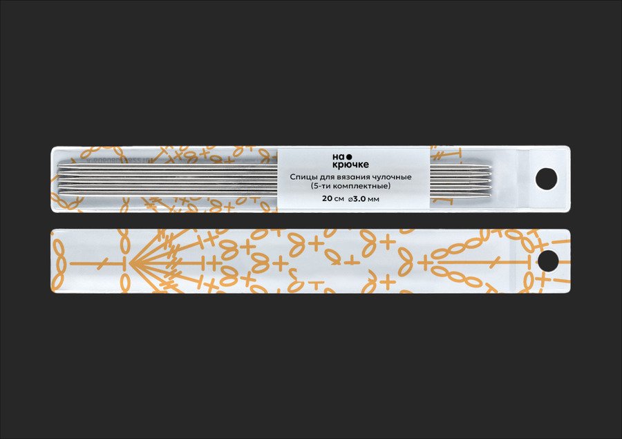 Knitting needle design for «на крючке». Close-up, engraving on a white knitting needle. Sans-serif typography. Minimalist, functional. —ar 1:1 —style raw —quality 2
