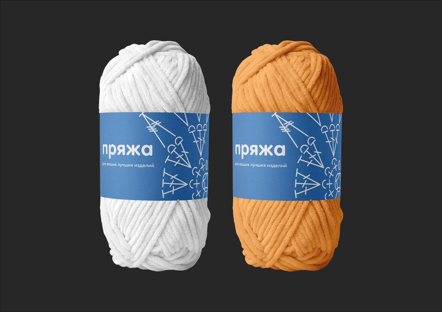 cinematic still life with two balls of blue and orange yarn. The studio name «на крючке» on the label with a vector design inspired by knitting patterns. Soft studio light, white backdround. —ar 1:1 —style raw —quality