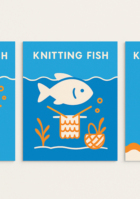 Create a series of 4 minimalist poster illustrations on mockups for a fictional knitting studio for fish, inspired by the style of the provided logo. The visual language should be clean, flat, and geometric, with a limited color palette of bright blue 5089c6, warm orange ffaa4c, and white. The imagery should feel light, balanced, and modern, with smooth, harmonious lines. The overall mood should be whimsical yet refined, evoking the cozy creativity of knitting in an underwater world. The typography, if used, should be clean and sans-serif