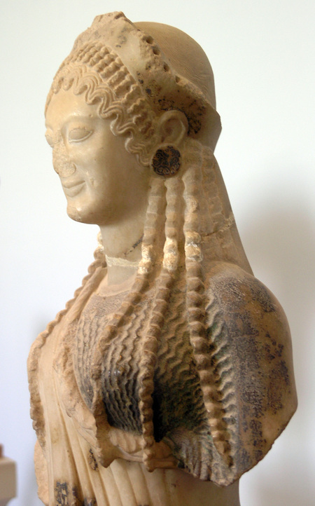 Слева — «Ника Самофракийская», ок. 190 год до н. э. Справа — «Хиосская кора», Архермос, ок. 520—510 гг. до н. э.