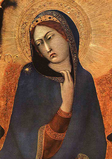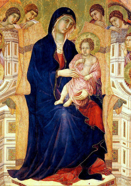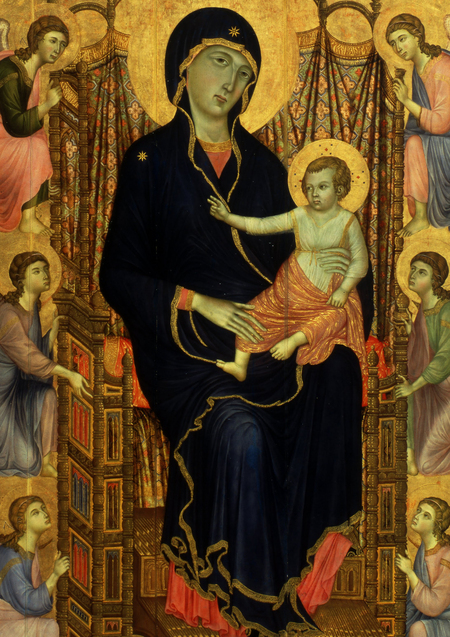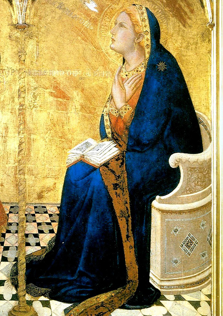 Слева — «Благовещение», Амброджо Лоренцетти, 1344 Справа — «Мадонна с младенцем», Дуччо ди Буонинсенья, 1285