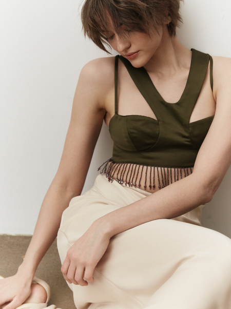 ss2023 Коллекция включает ключевые предметы: платья «Ночной обряд» и «Дневной обряд» с асимметричными вырезами, расшитыми вручную бисерной бахромой; брюки «Чпаг» в стиле карго с ремешками и карабинами; классические брюки «Дрягва» со стрелками; прозрачные лонгсливы «Вейа» с разрезами; укороченные топы «Баса» с ручной бисерной вышивкой; боди «Узы» с вырезом на спине.