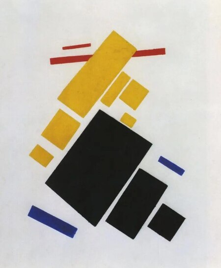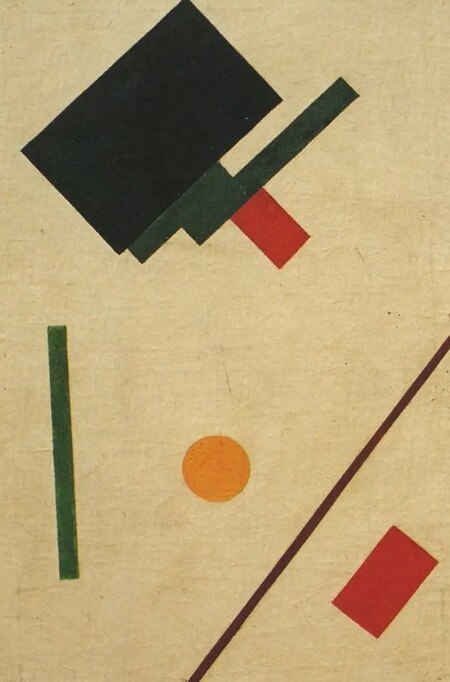 «Супрематизм — направление в авангардистском искусстве, основанное в 1915 году Казимиром Малевичем. Супрематизм является разновидностью абстракционизма и выражается в комбинациях разноцветных плоскостей простейших геометрических форм, таких как прямая линия, квадрат, круг и прямоугольник.» [6]
