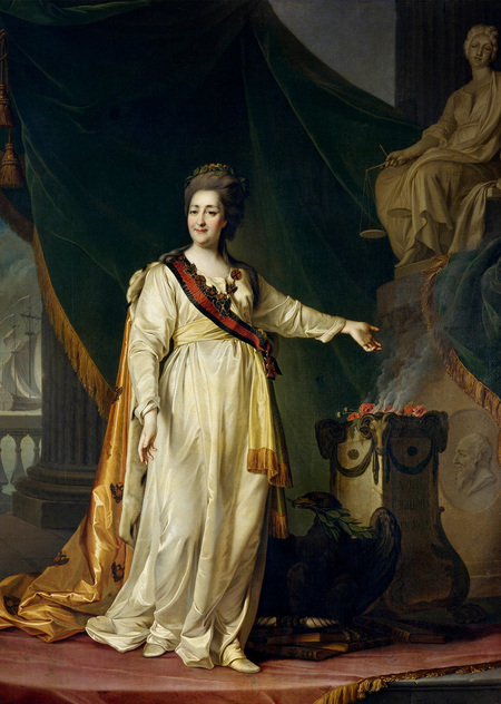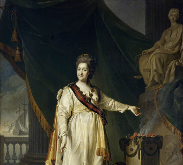 Её поза величественна — она столп государства. По композиции понятно, что мы находимся в храме правосудия; на эту мысль нас наталкивают колонны и статуя. Екатерина — верховная жрица, законодательница.