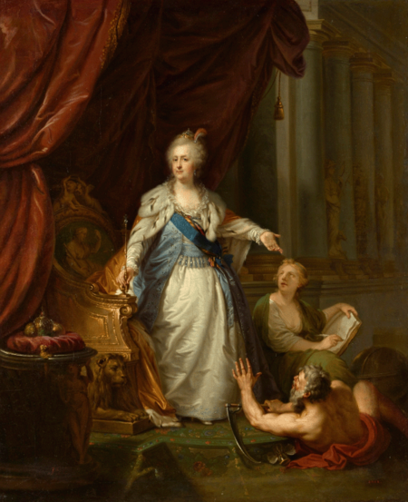 Фигура богини Истории изображена справа от Екатерины, где-то в глубине фона; она записывает деяния в книгу, а Сатурн, который часто символизирует время, находится у ног императрицы и присутствует как свидетель увековечивания событий.