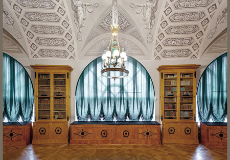 Библиотека Росси в Павловском дворце представляет собой двусветный зал с арочными окнами, наполненный светом и воздухом. Её главная особенность — цельный ансамбль встроенной мебели, включающий 19 высоких шкафов вдоль стен, большой овальный стол и полушкафы для работы. Интерьер, выдержанный в классическом стиле, объединяет мебель из волнистой берёзы, зелёную кожаную обивку и монументальную роспись потолка в технике гризайль, созданной по проекту Росси декоратором Б. Медичи [7].