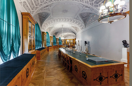 Бильярдная комната, спроектированная также в духе строгого классицизма, демонстрирует принцип единства функциональности и эстетики. Ее рациональная планировка удобна для игры и стилистически связана с остальными покоями. Светлые стены с четкой графикой линий и минимализм в декоре подчеркивают утилитарное назначение помещения, отражая характерный для Камерона лаконичный подход.