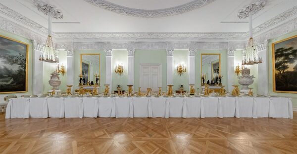 Белая столовая — центральное помещение первого этажа, которое вначале выполняло функцию парадной столовой, а позже — гостиной. Архитектор Чарльз Камерон придал его облику античное звучание, выбрав для оформления греческий стиль, где ведущую роль играют многочисленные пилястры, ритмично разделяющие стены [20].