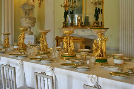 Белая столовая демонстрирует характерные для Камерона принципы строгого классицизма. Интерьер, выдержанный в светлых тонах, построен на четких пропорциях и лаконичных формах, что свидетельствует о влиянии палладианства. Большие окна обеспечивают прекрасное освещение, усиливая ощущение легкости и простора. Строгая, функциональная мебель без обильного декора завершает образ, подчеркивая утонченную элегантность [7].
