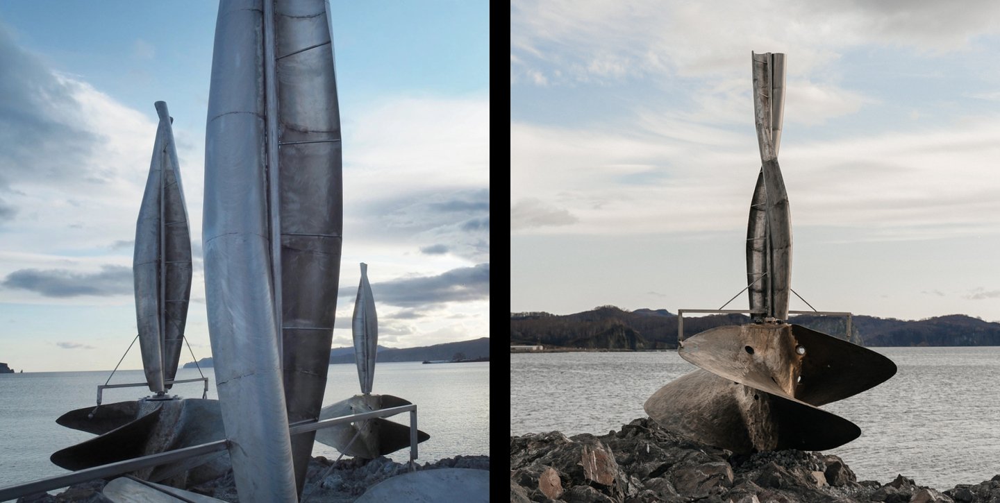 В рамках своего проекта Александр Пономарев создал карильон, в котором ветер вращает винты, а встроенные молоточки производят мелодию. Расположение объектов также имеет смысл — все они расположены на берегу, что символизирует память о тех, кого унесло море навсегда.