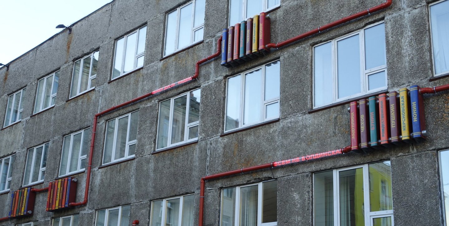 Данная инсталляция находится в Сибири. Как метафора, что батарею согревают, они были вынесены на фасад всего здания, и выстроены так, что греют не трубы, а книги.