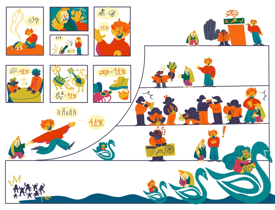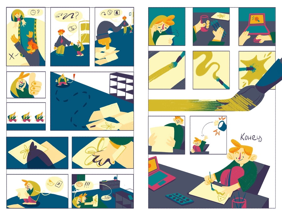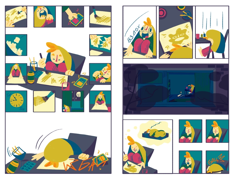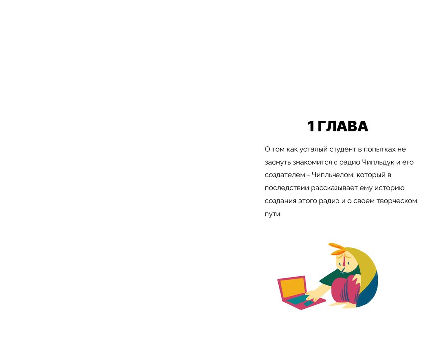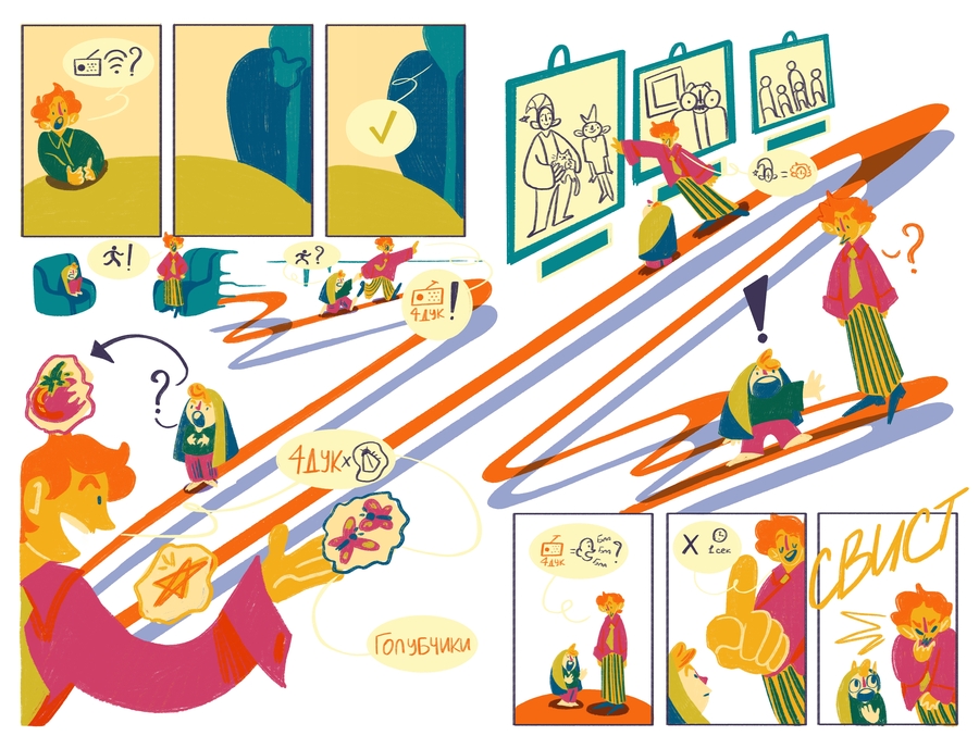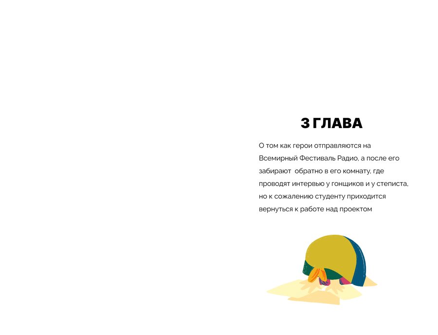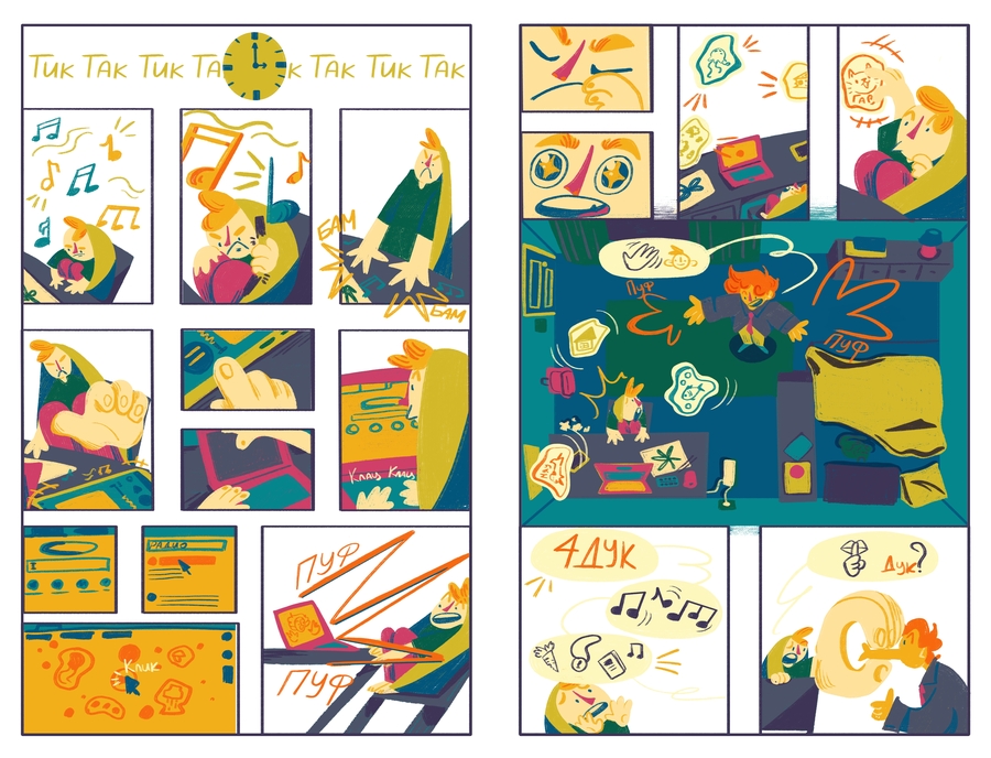 «Радиоволна 4Дук» — это немой комикс-репортаж, основанный на моем интервью с Андреем Гарольдовичем Кнышевым о его некоммерческом радио «Чипльдук». Это история о ночном открытии студента, погруженного в сессию, который случайно натыкается на радио «Чипльдук» и потом погружается в его необычный мир.