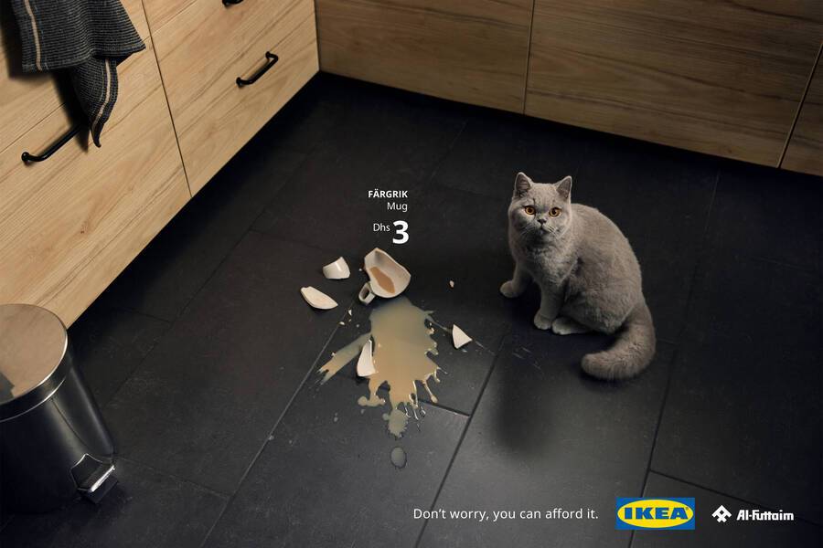Кампания «Не волнуйся, тебе по карману» подчёркивает идею доступности товаров через знакомые бытовые ситуации с домашними питомцами. На постерах показаны типичные «аварии»: щенок разорвал подушку, котёнок разбил кружку. Рядом нарисован крупный ценник и финальная фраза: «Don’t worry, you can afford it» («Не переживай, тебе это по карману»).