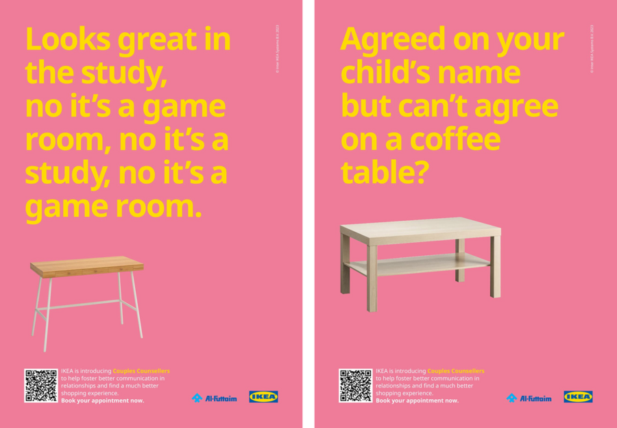 В этих постерах («Кризис отношений при покупке мебели — IKEA предлагает парную терапию») бренд обращает внимание на типичный бытовой конфликт: совместная покупка мебели как тест для пар.