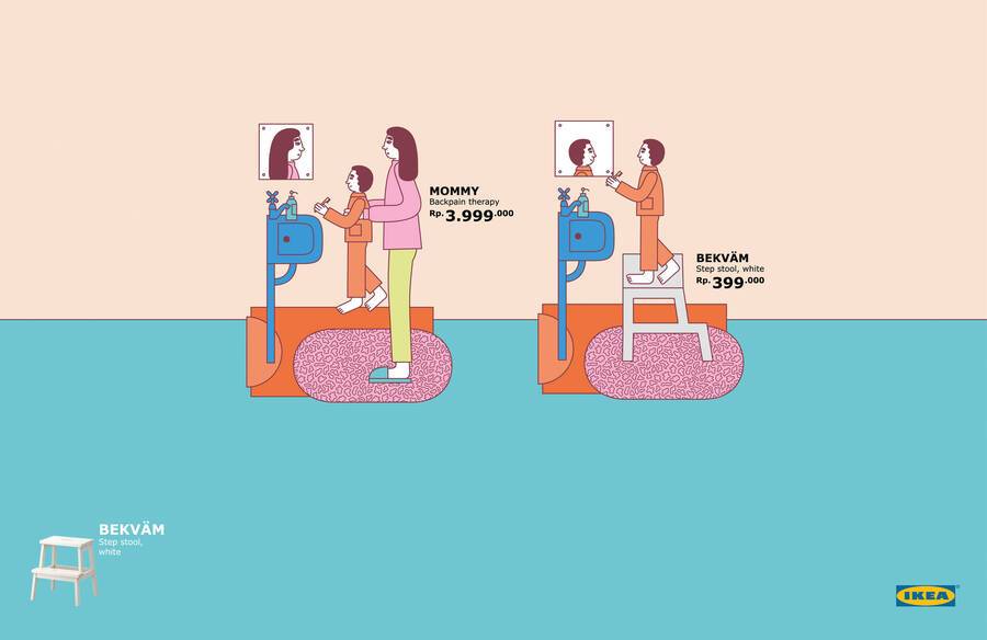 Следующая серия строится на простом приёме: характеристики людей сопоставлены с надёжностью товаров IKEA. В постере с мамой её «Backpain therapy» («лечение спины») противопоставляется недорогому табурету — копирайтинг подчёркивает, что решение может быть проще и дешевле.