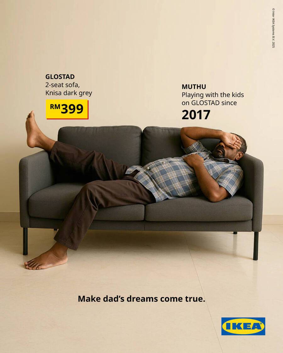 Фраза «Make dad’s dreams come true» («Осуществите мечты папы») создаёт настроение, что IKEA предлагает не покупку, а жест заботы о близком.