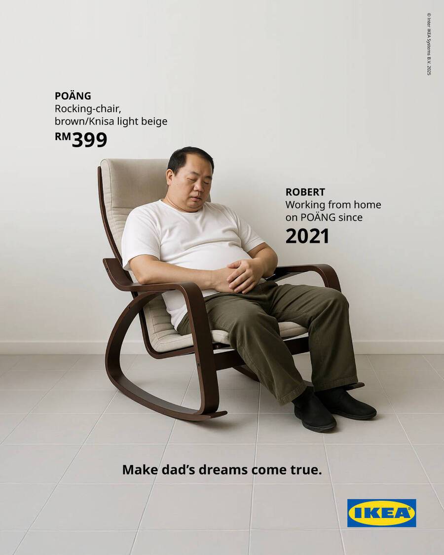 Продолжая тему отцов, копирайтинг следующей серии «Make dad’s dreams come true» построен на коротких строках, которые звучат как фрагмент реальной жизни. Каждая подпись рассказывает о привычке человека, связанной с конкретной мебелью IKEA. Изображение придает больше иронии, ведь не сходится с текстом, а изображает спящих отцов.