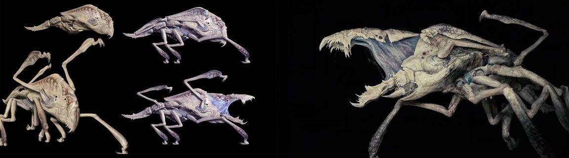Одни из существ — гигантские насекомые — выглядят как комбинация знакомых насекомых и невозможных форм: слишком длинные конечности, хищные мандибулы, стеклянные крылья. Их движения — быстрые, хаотичные, но при этом «программные»: CGI-анимация подчёркивает их ройную механику. Большие паукообразные существа — более медленные, и их пугающая сила в размере: тела покрыты органическими слизистыми слоями, причём цифровые деформации позволяют им разрываться, рождая паразитов.