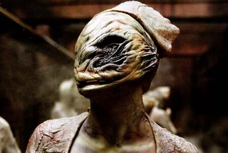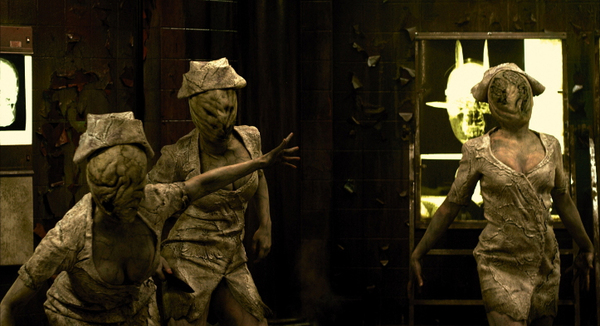 Монстры «Сайлент Хилла» — это не просто цифровые твари, а визуализированные психологические травмы. Хотя многие существа созданы в основном с помощью грима, именно CGI формирует их телесную абстракцию. Медсёстры, например, сняты с реальными актрисами, но их дёрганая, «порванная» пластика достигнута цифровой коррекцией движений: ускорением, неровными ключевыми кадрами, «сломом» походки. Их лица — слипшиеся, безглазые, с гротескно приподнятыми скулами — выглядят как один из самых удачных гибридов практических эффектов и цифровой коррекции текстур.