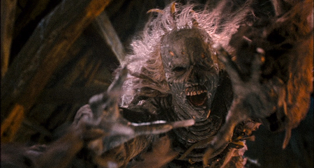 Особенно тревожны лесные твари — например, волчий всадник, чьё животное тело выглядит гипертрофированно: удлинённые лапы, выпирающие суставы, грим в сочетании с CGI-шерстью создают эффект монстра, который одновременно материальный и сказочно невозможный. Пиявочный мальчик — пример ранней цифровой мутации: его лицо «плывёт», губы и кожа двигаются с неестественной пластикой, вызывая отвращение на грани жалости. Эти монстры отражают страхи утраты детской фантазии и одновременно страх перед самой природой, которая в фильме представлена как автономная, первобытная сила.