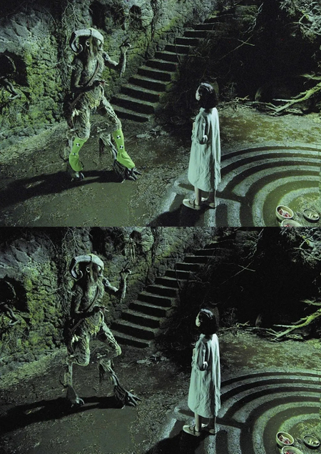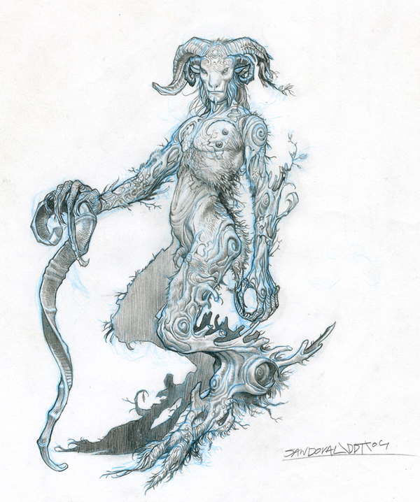 Концепцт-арт фавна и его гибридное (грим и CGI) воплощение для «Лабиринт Фавна» (2006) — реж. Гильермо дель Торо