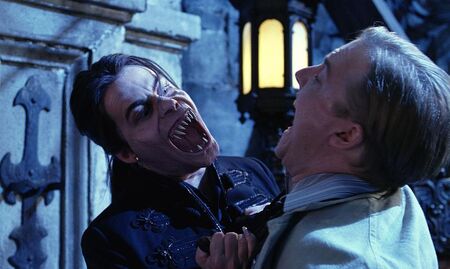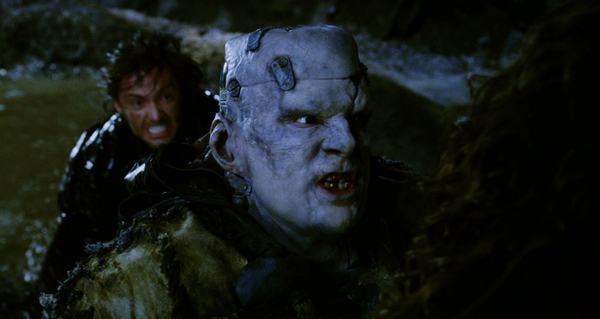 Фильм создаёт экстравагантный гибрид готической сказки и цифрового хоррора, где классические чудовища обретают новую, подчеркнуто зрелищную материальность. Именно здесь мифологические образы — вампиры, оборотни, Франкенштейн — перезаписываются под зрительские ожидания начала 2000-х, когда CGI воспринимался как территория безграничной пластики. Дракула представлен не только как харизматичный антагонист, но и как существо с амплитудной, почти театральной трансформацией: его монструозная форма — это вытянутая пасть, мембранные крылья, полупрозрачная кожа и резкие тени, подчёркивающие хищное выражение лица. Оборотни же — один из наиболее выразительных цифровых элементов фильма: их превращение снято как «выворачивание» тела, с хрустящими суставами и визуально ощущаемой ломкой костей, будто человеческая оболочка оказывается временным футляром для истинного зверя. Франкенштейн, напротив, сочетает практический грим и цифровые элементы: его тело кажется сшитым из технологических деталей, кабелей и шрамов, символизируя страх перед механизацией человека.
