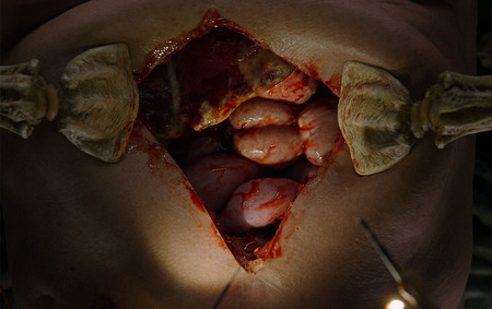 Монструозность в фильме проявляется в эстетизации хирургии: вскрытая плоть выглядит слишком чистой, почти глянцевой. CGI позволяет сохранить стерильную ровность краёв разрезов, плавность работы механических «оперирующих кресел», которые сами по себе становятся техно-органическими монстрами.