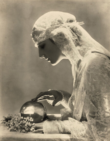 Фэшн-фотография этого периода вырастает из салонного портрета викторианской эпохи: фотографы снимают дебютанток и актрис, а возраст по умолчанию — «социально идеальный»: молодая, но уже «состоявшаяся» женщина высшего класса. Модели в этих кадрах выглядят не столько юными, сколько вне времени: мягкий фокус, сглаженное лицо, отсутствие бытовых деталей — классический приём стирания возраста. Стайхен позже снимает актрису Глорию Свенсон (1924, опубликовано в Vanity Fair 1928): её лицо под чёрной вуалью превращается в загадочную маску кинодивы, где биологический возраст уступает месту «экранной» персоне.