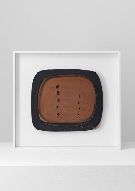 Здесь четыре идеальных дырки (бучи), расположенных в вертикальной колонне, пронзают поверхность круглого керамического блюда. Бучи пронзают черный овал, очерченный линией неглазурованной терракоты в центре блюда, слегка окрашенной в кремово-бежевый цвет. «Брызги» той же кремовой краски или шликера, кажется, вырываются из бучи, как будто жест художника проник в этот нижний слой еще влажной краски и заставил ее разбрызгаться.