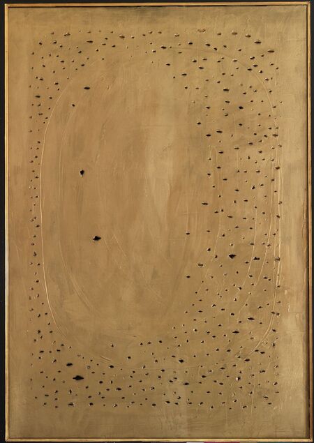 Цвет в первых работах из серии «Дыры», выполненных между 1949 и 1950 годами, используется крайне редко, но его наличие дополнительно усиливает дематериализующий эффект света, проникающего через отверстия в белом либо негрунтованном холсте. В сочетании с перфорированной поверхностью свет вырисовывает рельефные, глубокие узоры из разнообразных завихрений и неожиданных сочетаний отверстий, которые и составляют основу композиции.