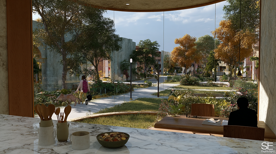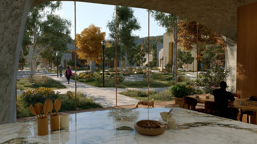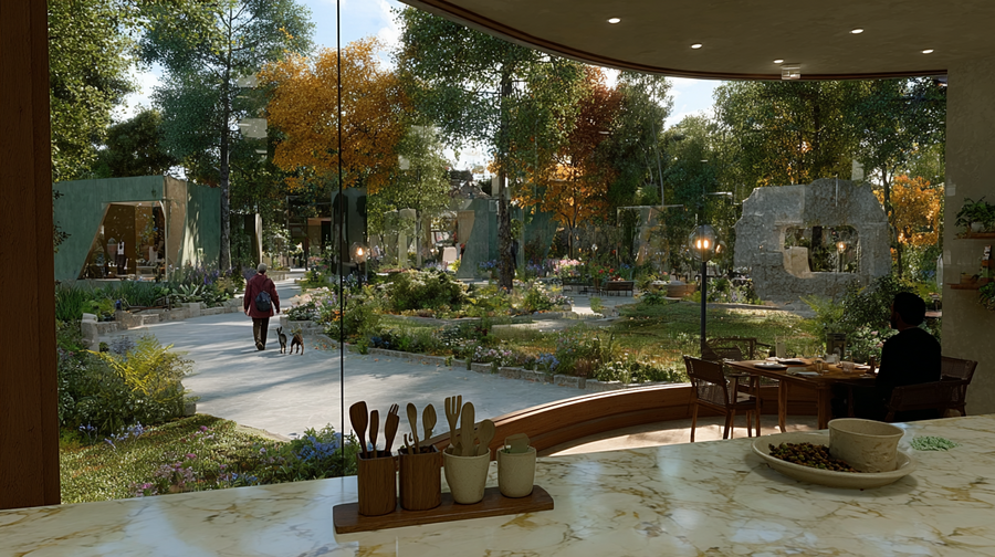promt: (link) (link) (link) The image shows a cozy interior opening to a vibrant outdoor view. In the foreground, a marble countertop holds kitchen utensils and a bowl of food, exuding elegance. Through a large curved window, a child in a pink jacket walks a dog along a green, autumn-colored path beside modern buildings. Inside, a person in dark clothing enjoys a drink at a wooden table. Natural light and earthy tones create a warm, peaceful harmony between indoors and outdoors. — ar 16:9