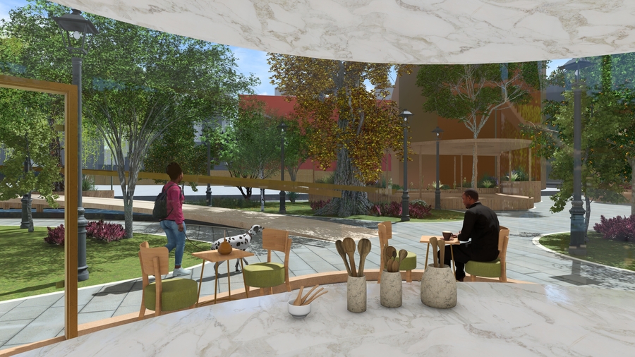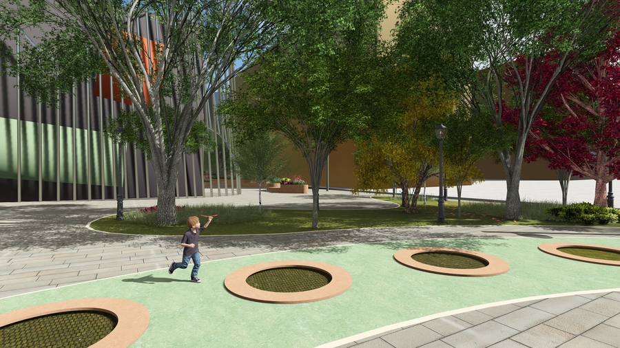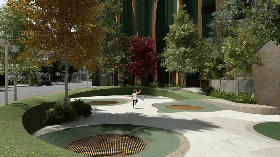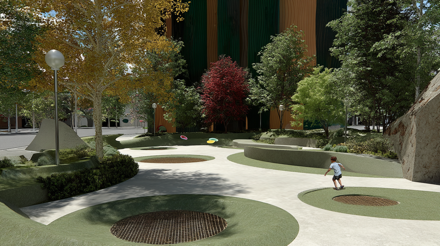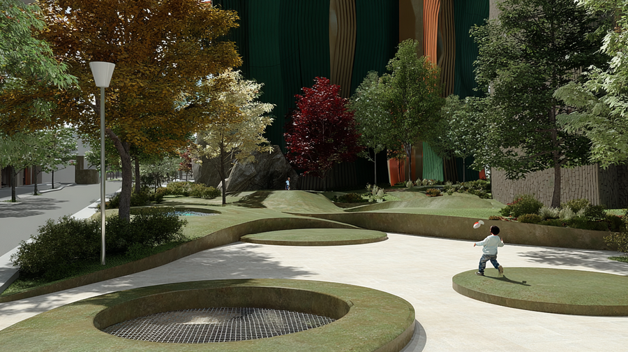 promt: (link) (link) (link) Modern landscaped park with autumn trees in yellow and red, smooth light ground with circular recessed features, and a child running with a frisbee. Street lamps and a large modern building with green and orange facade in the background. Clean, bright, inviting design blending nature and urban elements. --ar 16:9