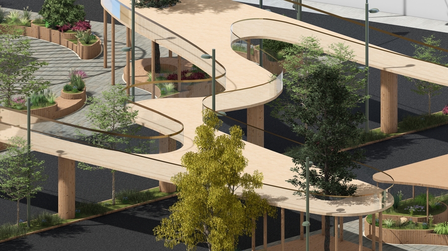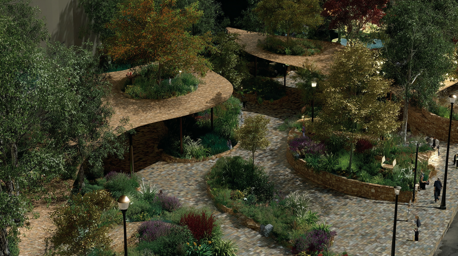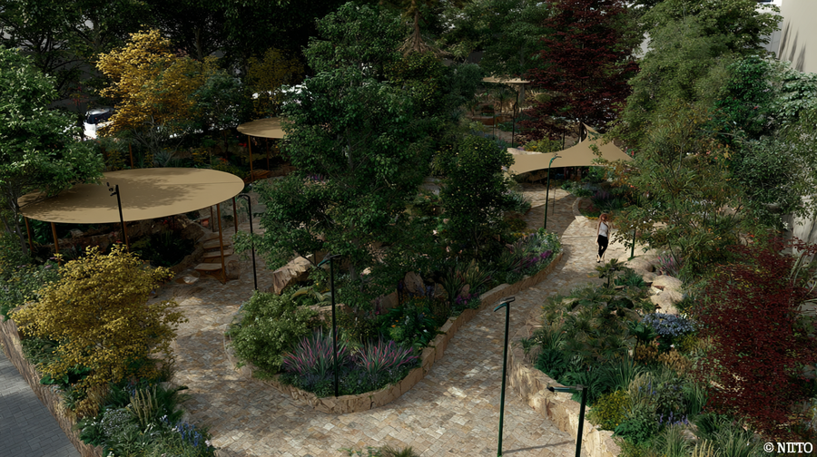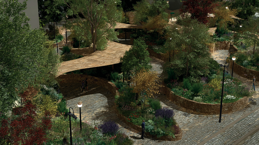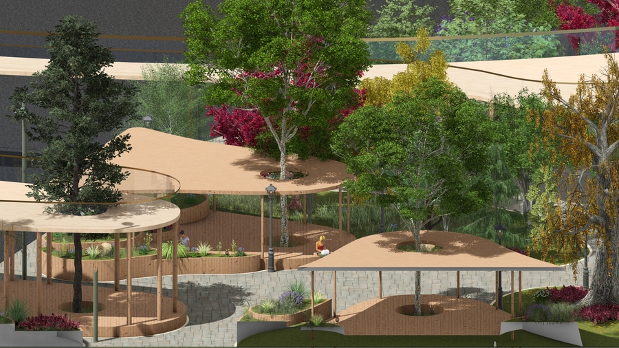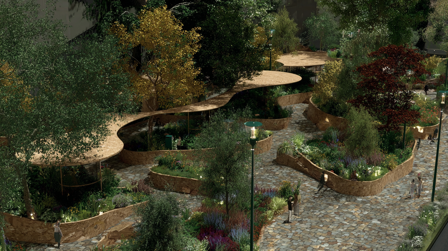 promt: (link) (link) (link) A vibrant modern outdoor landscape merging nature and architecture. Circular wooden platforms encircle trees with green, yellow, and red leaves, forming flowing, connected seating areas. Stone paths wind through lush greenery and colorful shrubs in purple, green, and red hues. A person with bags walks along the lit pathway, adding life to the inviting, harmonious space designed for leisure and social interaction. --ar 16:9