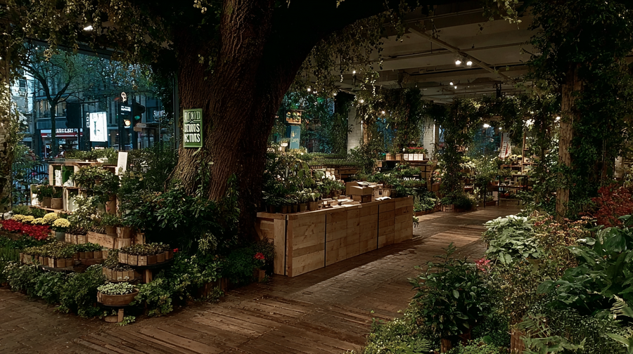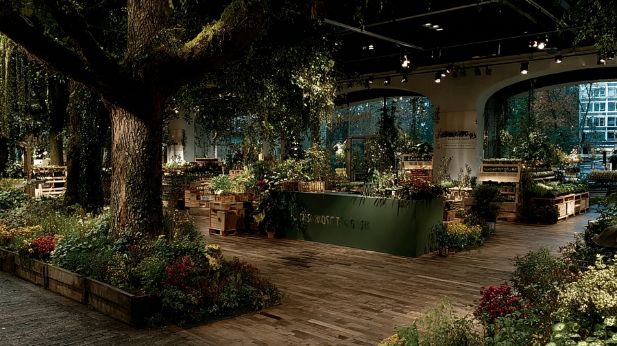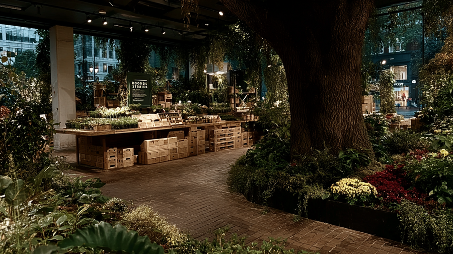 promt interior: (link) (link) (link) Create a store interior for selling tree seedlings and plant seeds from the brand ROOTS & SHOOTS. — ar 16:9