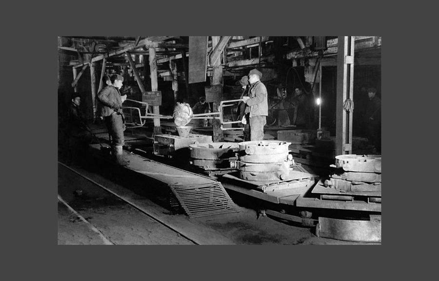 Челябинск. Рабочие оборонного металлургического завода заливают расплавленный металл в форму. 1940-е \ Челябинск. Ремесленное училище № 2. Учащиеся группы № 1 за расточкой «изделий». 1942